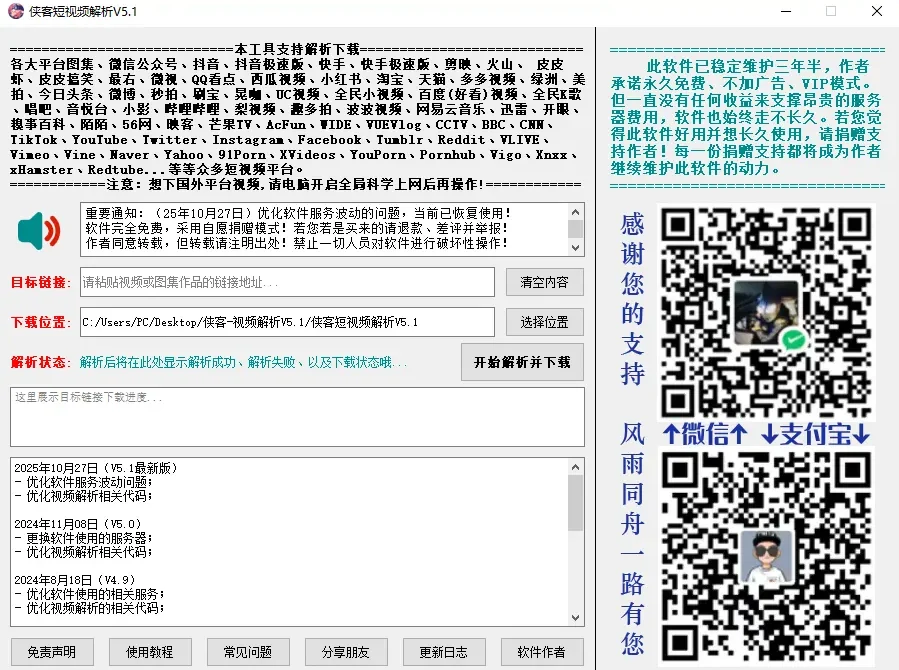 【更新V5.1】侠客短视频解析去水印工具-支持国内外众多短视频平台 雨和三号线 2025-10-29 11 0 软件简介: 本工具支持无水印解析下载抖音、抖音极速版、快手、快手极速版、剪映、火山、皮皮虾、皮皮搞笑、最右、微视、QQ看点、西瓜视频、小红书、淘宝、天猫、绿洲、美拍、今日头条、微博、各国外平台(随缘)、各平台图集、微信公众号...等等众多短视频平台。 软件界面: 下载地址: 立即下载 侠客短视频解析去水印工具-支持国内外众多短视频平台 1年前 (2024-06-10) 0 本文作者为雨和三号线,转载请注明。 实用工具 绿色版 视频解析 0人点赞